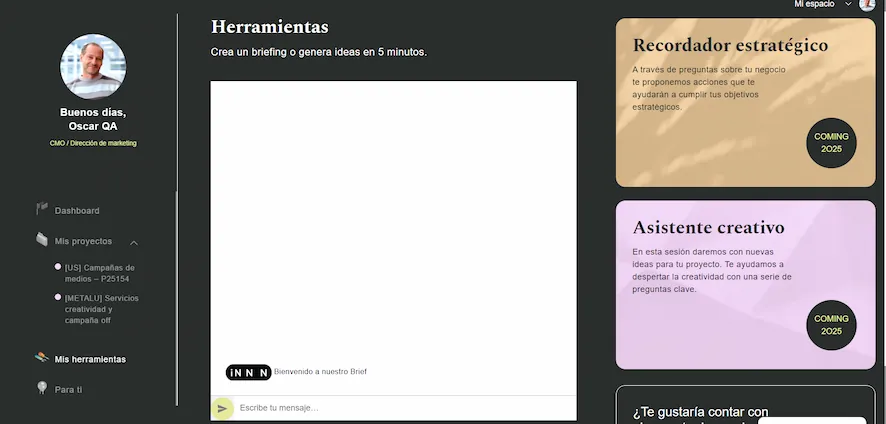 Asumiendo el rol de CTO temporal de la empresa, nos integramos a los actuales equipos y los coordinamos para alcanzar los objetivos planteados en los plazos acordados. Además, sumamos un nuevo equipo experto en IA para desarrollar un asistente de IA como experto en marketing que, con las instrucciones y base de conocimientos de Innn, logró aportar valor real a sus clientes.